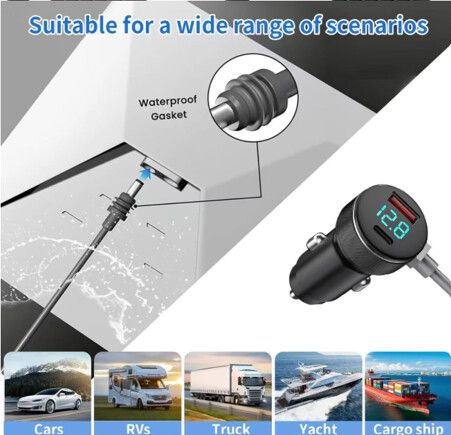 Input: DC12V-24V Output: QC:5V-3A 9V-2A 12V-1.5A (18W) TYPE-C:5V-3A 9V-3A 12V-3A 15V-3A 20V – 2.25A(45W) PPS ;3.3V-11V-5A(55W) DC:12V-24V(100W) Cable embutido en cargador, puerto USB y T-C