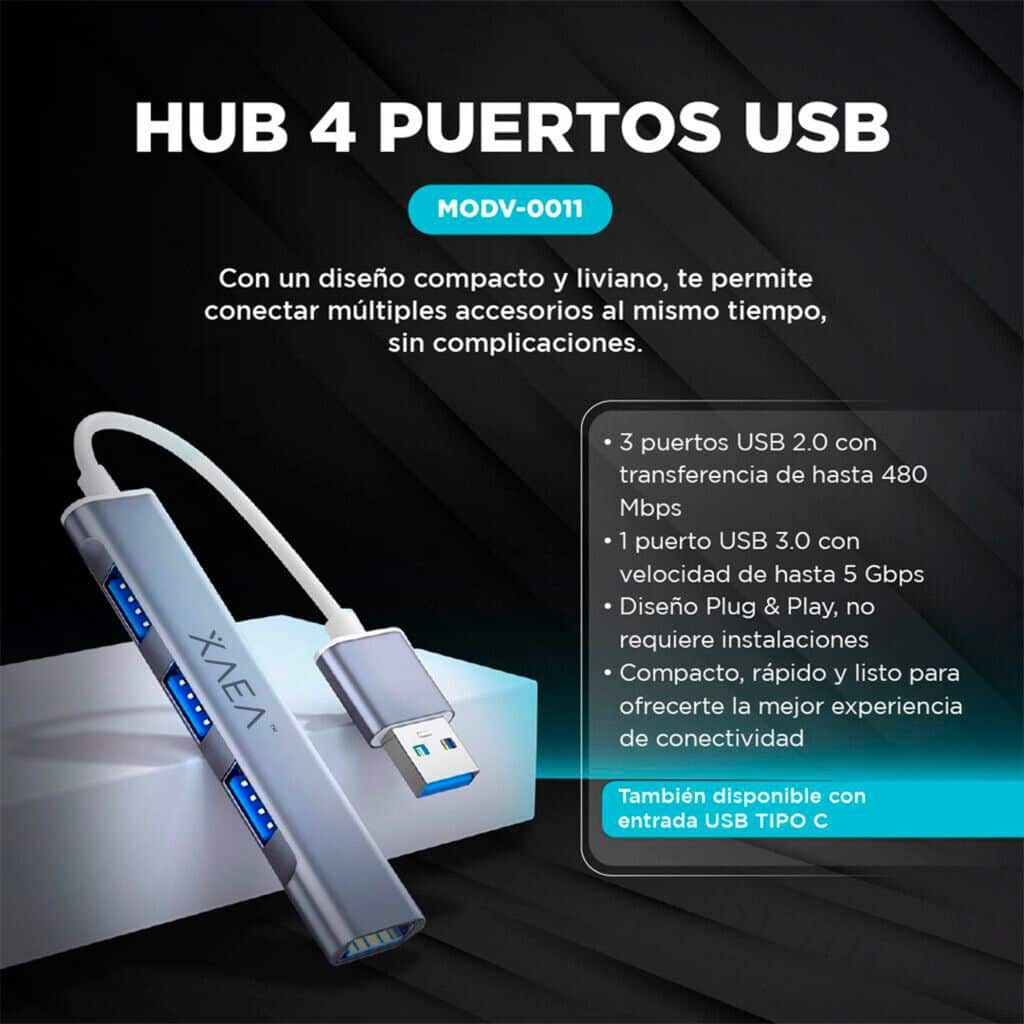 Tus clientes necesitan soluciones prácticas para ampliar la cantidad de puertos disponibles, y este hub es la respuesta perfecta. Con un diseño compacto y liviano, ofrece 4 entradas USB para conectar múltiples accesorios al mismo tiempo, sin complicaciones.