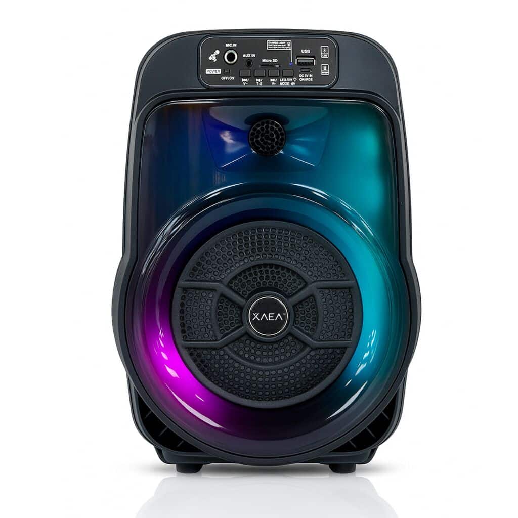 Un modelo compacto con gran potencia de sonido (10W) y efectos LED integrados que acompañan el ritmo de la música. Ofrece conectividad completa (Bluetooth, USB, TF, TWS y entrada para micrófono), ideal para karaoke o eventos pequeños.